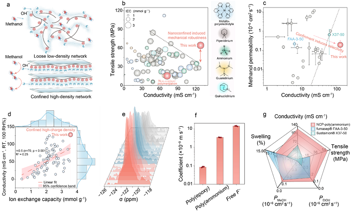 图3展示了 NCP 构筑的“高密度网络”不仅在微结构上致密,而且在宏观工程指标上可被量化验证。作者将 NCP 进一步扩展到带正电的阴离子型poly(ammonium) 体系后,得到截面致密、无缺陷结构的阴离子交换膜,并给出体密度 1.56 g cm⁻³;压力驱动渗透测试得到跨膜水通量 0.85-1.91 LMH·bar⁻¹,与典型脱盐膜同量级,用于侧面佐证其“致密而连续”的膜结构;同时该致密网络也带来可观的力学强度,抗拉强度为 64.2 MPa,约为常规的阴离子交换膜两倍量级。这说明了 NCP 的核心产物特征是“高密度、低缺陷、连续网络”:密度指标(~1.56 g cm⁻³)与渗透/力学的综合表现共同支撑“结构致密化”这一主张。