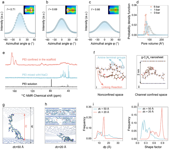 把压力用作结构调控手段:随压力增加,片层取向因子从 0.66 提升到 0.71,同时膜密度从 1.10 g cm⁻³ 提升到 1.51 g cm⁻³,并明确指出致密化来自 pressure-induced spatial confinement。