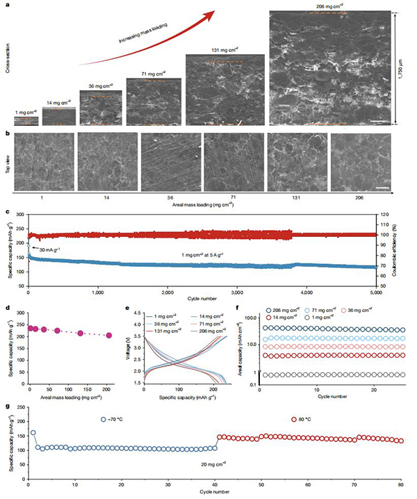 2.制备了实用的2.5 Ah锂-有机软包电池,实现了255 Wh kg-1的卓越能量密度,且在-70°C至80°C的宽温区内均能高效运行,并展现出优异的柔韧性和安全性,标志着其在极端条件应用和可穿戴电子设备领域具有巨大潜力。