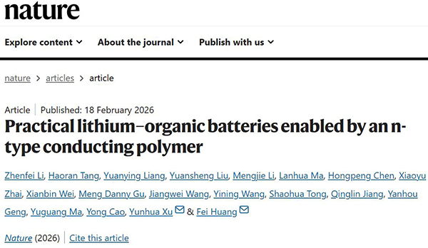 文献链接:“Practical lithium–organic batteries enabled by an n-type conducting polymer”(Nature,2025,10.1038/s41586-026-10174-7)