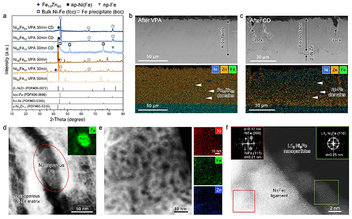 图3展示Ni-Fe体系在VPA-CD过程中的结构演化。脱合金过程中形成纳米多孔Ni(Fe)骨架,并原位生成有序Ni₃Fe纳米颗粒,构建稳定异质界面结构,为高效析氧反应提供协同催化位点。