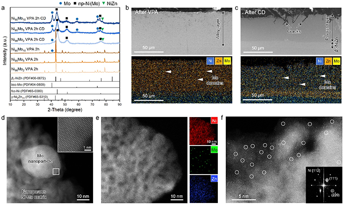 Figure 2 | Structural and morphological evolution of Ni–Mo alloys during the VPA-CD process. (a) XRD patterns of Ni98Mo2, Ni95Mo5, and Ni90Mo10 sheets in pristine, surface-alloyed (VPA 500 ℃, 2 h), and chemically dealloyed states. (b) Cross-sectional SEM image and EDS mapping of the surface-alloyed Ni90Mo10 sheet (VPA 500 ℃, 1 h), showing a uniform Zn-rich surface layer with embedded bcc-Mo precipitates. (c) Cross-sectional SEM image and EDS mapping of the chemically dealloyed Ni₉₀Mo₁₀ sheet, showing a conformal nanoporous Ni-Mo surface layer metallurgically bonded to the dense substrate with a thin β1-NiZn interlayer. (d) HAADF-STEM image of the nanoporous Ni–Mo layer, showing a Mo nanoparticle dispersed within the nanoporous Ni-Mo matrix. Inset: atomic-resolution lattice structure of the bcc-Mo nanoparticle. (e) HAADF-STEM image and EDS mapping of the nanoporous Ni-Mo matrix, showing Ni and residual Zn uniformly distributed, with weak Mo signals. (f) Atomic-resolution HAADF-STEM image of the nanoporous Ni-Mo matrix, revealing substitutional Mo single atoms (highlighted by white circles) dispersed within the Ni ligaments. Inset: corresponding fast Fourier transform (FFT) pattern.