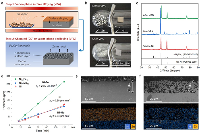 Figure 1 | Vapor-phase surface alloying–dealloying for in situ manufacturing of nanoporous Ni layers on bulk Ni sheets. (a) Schematic of the two-step process: Zn vapor-induced surface alloying (VPA) followed by selective dealloying—either chemical (CD) or vapor-phase dealloying (VPD)—to generate a nanoporous surface layer. (b) Experimental setup for VPA. (c) XRD patterns of Ni sheets in pristine, surface-alloyed (VPA 500 ℃, 1 h), and vapor-phase dealloyed states. (d) Thickness of the surface alloy layer as a function of VPA time at 500 ℃ for Ni, Ni90Mo10, and Ni85Fe15 sheets. (e) Cross-sectional SEM image and corresponding EDS mapping of the surface-alloyed Ni sheet (VPA 500 ℃, 1 h), showing a uniform γ-Ni2Zn11 layer. (f) Cross-sectional SEM image and EDS mapping of the vapor-phase dealloyed Ni sheet, showing a porous Ni surface layer metallurgically integrated with the dense Ni substrate.
