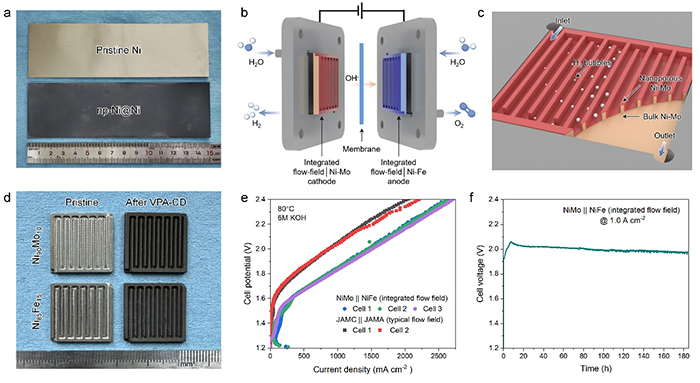 Figure 5 | Integrated “flow-field│catalyst” architectures enabled by VPA-CD. (a) Photograph of a large-area bulk-supported nanoporous Ni electrode (15 cm × 4.5 cm) fabricated via VPA-CD. (b) Schematic illustration of an alkaline water electrolyzer employing integrated “flow-field│catalyst” electrodes. (c) Schematic illustration of the structure of the integrated “flow-field│Ni-Mo” HER electrode. (d) Photograph of patterned Ni90Mo10 and Ni85Fe15 electrodes machined into serpentine flow-field structures before and after VPA-CD processing. (e) Polarization curves of the integrated electrolyzers using patterned nanoporous Ni90Mo10 cathodes paired with the nanoporous Ni85Fe15 anodes at 80 ℃ in 6 M KOH, compared with commercial JAMC/JAMA electrodes in a conventional electrolyzer with serpentine flow-field. (f) Long-term stability of the integrated electrolyzer operated at 1.0 A cm-2 for 185 h.