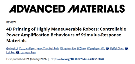 论文摘要:高机动性的机器人能够跨越障碍物或快速移动,利用奔跑、跳跃、弹射或多多运动模态组合,在航空航天、农业、医疗等领域展现出优势。由于高能爆发的行为和运动中的巨大振动,这些机器人需要简单且可靠。4D打印高机动性的机器人通过结合刺激响应材料的功率放大和增材制造技术来应对这一挑战。它将执行、感应和控制模块集成为一个组件,结构高度集成,运动可控且具备高机动性。本文将综述基于4D打印高机动性机器人,重点关注从设计到制造的关键技术。首先,概述了4D打印高机动性机器人的制造工艺。然后,从仿生学的角度,复习功率放大的结构设计。在总结适用于4D打印高机动性机器人的刺激-响应材料后,详细阐述了控制机器人运动方向、速度、模式和响应时间的策略。最后,重点介绍了当前面临的挑战以及对高度机动性机器人4D打印的展望。