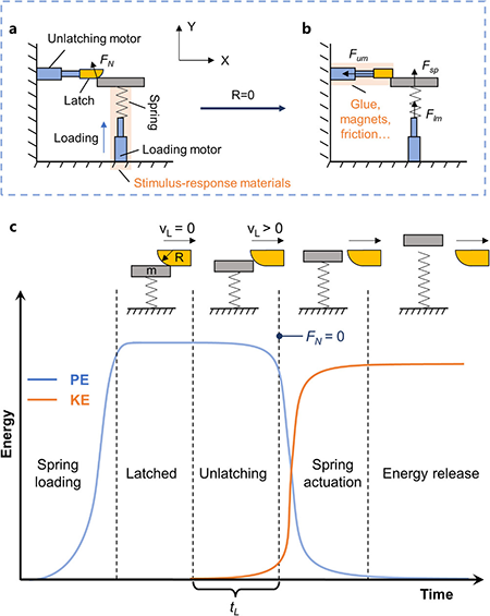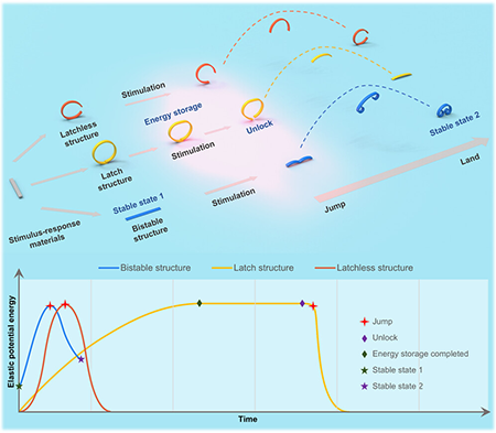 图10. 闩锁结构4D打印高机动性机器人的简化模型和能量转换过程