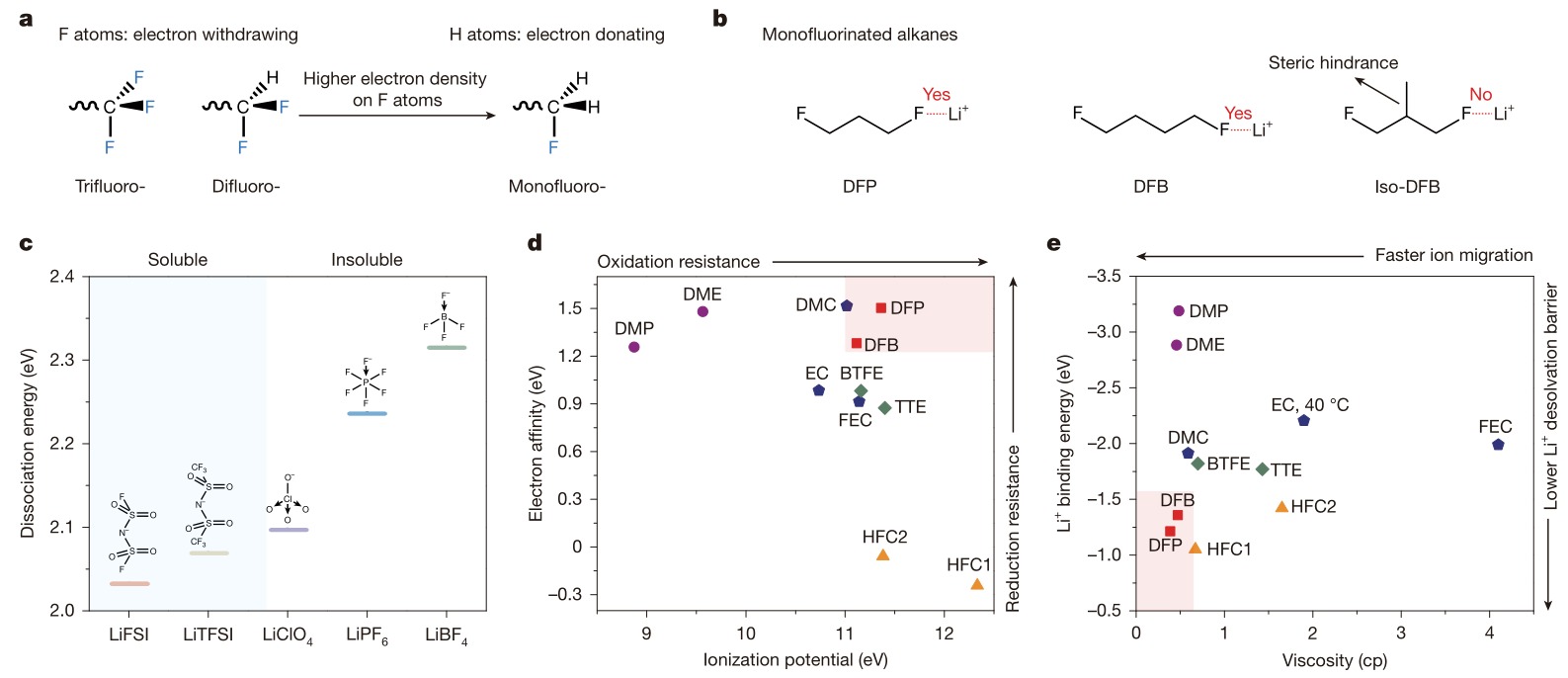 图1氢氟烃作为电解液溶剂的设计原理与特性:(a)与二氟甲基和三氟甲基相比,单氟甲基中氟原子更高的电子密度有利于离子解离;(b)基于该原理,设计并合成了双侧单氟化烷烃1,4-二氟丁烷和1,3-二氟丙烷,二者对双氟磺酰亚胺锂和双氟磺酰亚胺钠具有高溶解度(大于2摩尔每升),而结构相似的异二氟丁烷因甲基带来的空间位阻无法溶解锂盐;(c)从单晶到游离锂离子和阴离子的计算能量变化;(d)所合成的氢氟烃与锂电池常用溶剂的电离势和电子亲和能图谱;(e)锂离子结合能和粘度图谱(25摄氏度)。© 2026 Springer Nature