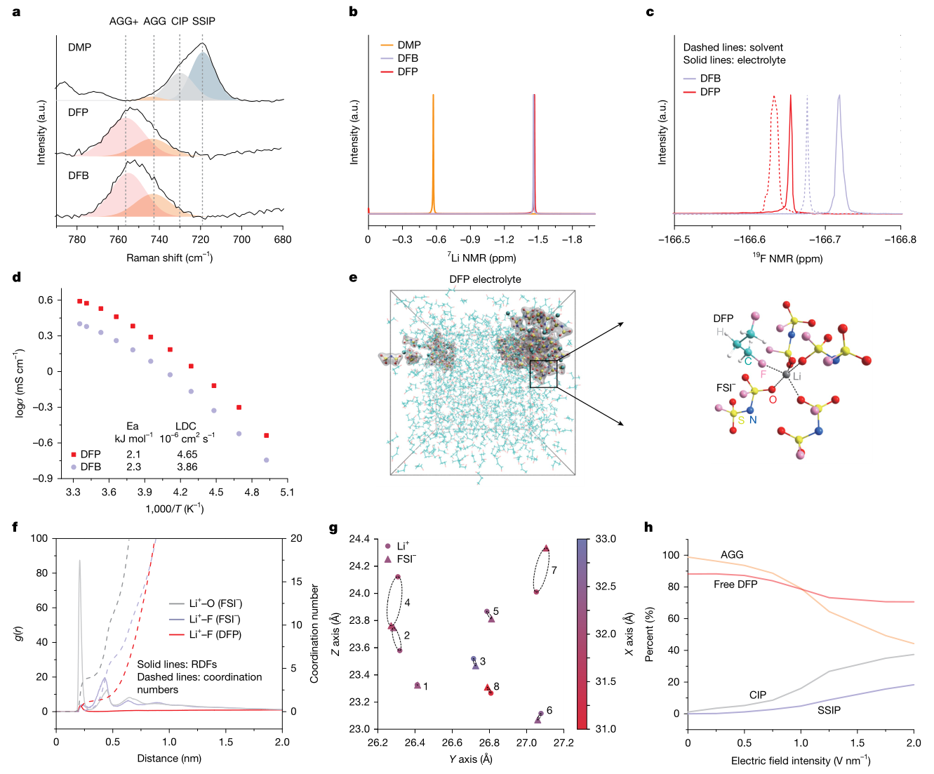 图2电解液的溶剂化结构表征与离子传输机制。(a-c)1,3-二氟丙烷(DFP)和1,4-二氟丁烷(DFB)电解液的拉曼光谱(a)、锂-7核磁共振谱(b)、氟-19核磁共振谱(c),并以1,3-二甲氧基丙烷电解液作为参照样;(d)1,3-二氟丙烷和1,4-二氟丁烷电解液的离子电导率;(e)分子动力学模拟箱的快照(左)与1,3-二氟丙烷电解液典型的溶剂化结构(右);(f)锂离子–氟(1,3-二氟丙烷)、锂离子–氧(双氟磺酰亚胺根)、锂离子–氟(双氟磺酰亚胺根)对应的径向分布函数与配位数;(g)连续8帧下锂离子与双氟磺酰亚胺根的运动轨迹;(h)施加电压的分子动力学模拟所得1,3-二氟丙烷电解液溶剂化结构的变化。© 2026 Springer Nature