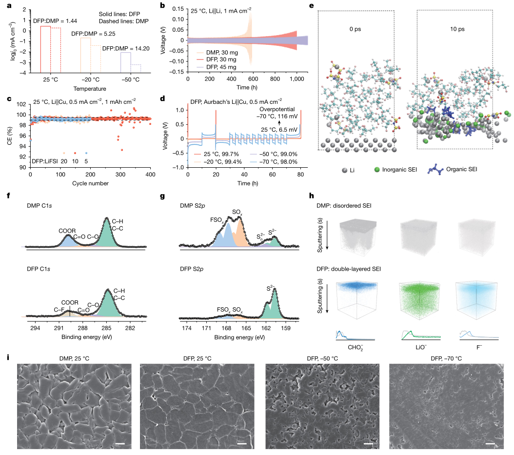 图3锂金属沉积/剥离行为及对应的固体电解质界面表征。(a)使用1,3-二甲氧基丙烷和1,3-二氟丙烷电解液的锂对称电池的交换电流密度;(b)1 mA cm−2 ,1 mAh cm−2 (25 °C)下,使用两种电解液的锂对称电池的恒电流锂沉积/剥离曲线;(c)0.5 mA cm−2,1 mAh cm−2 (25 °C)下,不同摩尔比1,3-二氟丙烷–双氟磺酰亚胺锂电解液的锂铜电池循环库伦效率;(d)不同温度下,采用Aurbach’s方法测试的锂铜电池恒电流锂沉积/剥离曲线;(e)25、-50和-70°C下,1,3-二氟丙烷电解液在锂负极表面界面分解反应的从头算分子动力学模拟快照;(f,g)1,3-二甲氧基丙烷和1,3-二氟丙烷电解液中沉积锂表面固体电解质界面的X射线光电子能谱C 1s分析(f)与S 2p分析(g);(h)两种电解液中固体电解质界面的飞行时间二次离子质谱三维纳米结构,以及甲酸根、氧化锂根与氟离子的相对含量;(i)25、-50和-70°C下,1,3-二甲氧基丙烷与1,3-二氟丙烷电解液中沉积锂的扫描电子显微镜图像。© 2026 Springer Nature