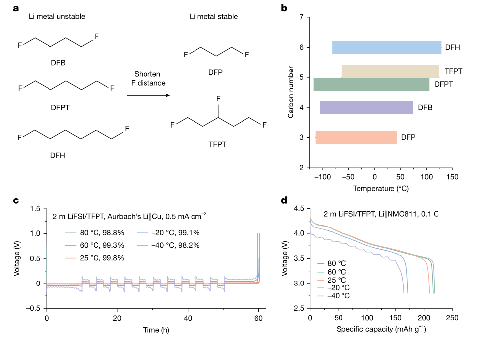 图5氢氟烃电解液向宽温域锂金属电池的拓展。(a)五种具有溶盐能力的合成单氟化氢氟烃的结构,以及其对锂金属负极的稳定性规律;(b)所合成氢氟烃的液态温度范围;(c)80至-40摄氏度下,采用Aurbach’s方法测试的锂铜电池恒电流锂沉积/剥离曲线;(d)80至-40摄氏度下,Li∥NMC811电池中的放电曲线。© 2026 Springer Nature