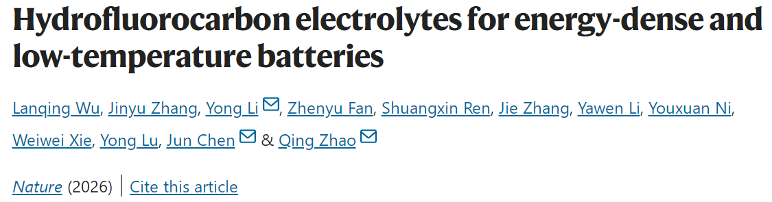 原文详情:Wu, L., Zhang, J., Li, Y. et al. Hydrofluorocarbon electrolytes for energy-dense and low-temperature batteries. Nature (2026). https://doi.org/10.1038/s41586-026-10210-6