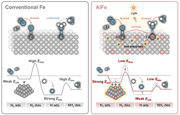 图1 合成氨在传统Fe基催化剂与AlFe合金催化剂上的反应机制。