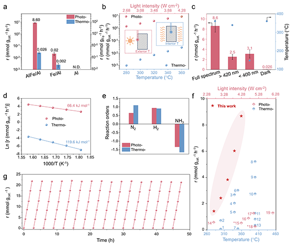 随后,将所制备的AlFe/Al纳米合金应用于光催化合成氨反应。如图3a所示,在0.1 MPa和4.28 W cm-2条件下,AlFe/Al光催化活性高达8.6 mmol g-1 h-1。较Fe/Al提升了2-3个数量级,充分体现了合金化策略对催化活性的显著增强作用。为厘清光效应与热效应的贡献,作者设计了对比实验,考察不同光照条件下对应等效温度的热催化活性。结果显示,热催化活性远低于光催化活性(图3b);在紫外光照射下(等效温度148 °C),其催化活性仍高于热反应在400 °C下的表现(图3c),证实了光效应在催化过程中发挥了主导作用。进一步催化动力学测试表明,光催化反应的活化能显著低于热催化过程,同时N2反应级数降低、NH3反应级数升高,说明光效应有效加速了反应动力学进程(图3d–e)。得益于光效应的显著增强,AlFe/Al催化剂展现出优异的光催化合成氨性能,超越了目前已报道的大多数光催化剂,甚至优于商业Fe基热催化剂(图3f)。此外,经过长达50小时的循环测试,该催化剂仍保持优异的化学稳定性,展现出良好的应用潜力(图3g)。