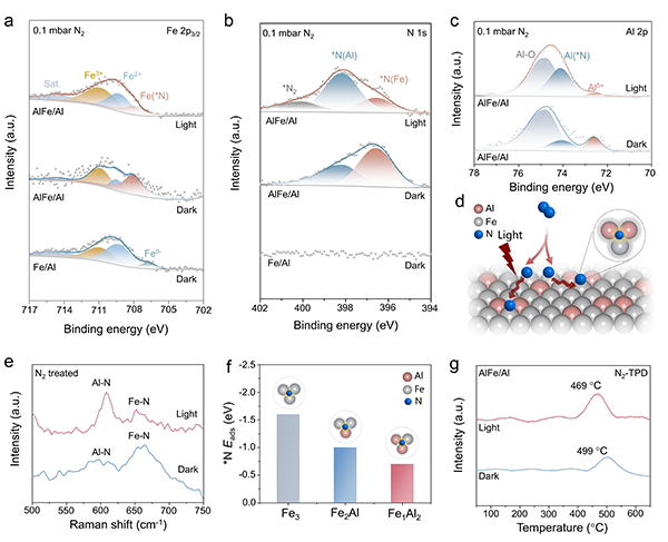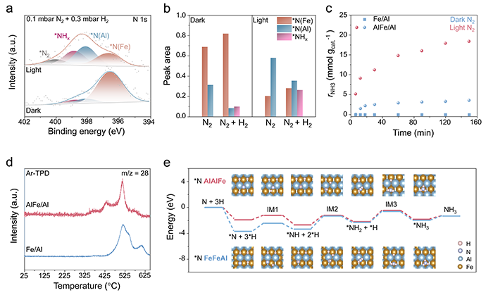 为深入探究氮物种在催化剂表面的迁移与演化规律,作者利用近常压X射线光电子能谱(NAP-XPS)对反应过程进行了原位追踪。如图5a所示,在N2气氛、黑暗条件下,Fe/Al表面主要存在氧化态的Fe2+/Fe3+及少量零价Fe。而在AlFe合金中,零价Fe信号消失,708.0 eV处出现新物种,归属为Fe位点上吸附的解离氮物种Fe(*N),表明Al的引入有效促进了N2活化。施加光照后,Fe(*N)信号减弱,暗示该物种可能发生转移。进一步分析N 1s和Al 2p XPS谱图(图5b–c)发现,光照下与Al相关的氮物种[Al(*N)和*N(Al)]信号显著增强,表明氮物种从Fe位点溢流至相邻Al位点,实现了双活性位点间的空间分离(图5d)。拉曼光谱也检测到两种不同类型的表面氮物种,与NAP-XPS结果一致(图5e)。理论计算进一步揭示了Al位点的作用:吸附能计算表明,富Al位点对解离氮物种的吸附能最正(图5f),即吸附较弱,有利于后续加氢及NH3脱附。N2程序升温脱附(N2-TPD)实验也证实,AlFe合金光照下表现出更低的氮脱附温度(图5g),从实验上验证了弱吸附位点的形成。
