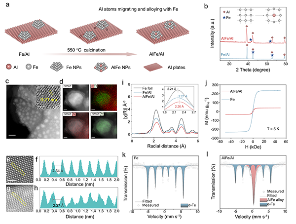 本研究通过反应性金属-载体相互作用,在Al基底上成功构筑了AlFe纳米合金(AlFe/Al)。X射线衍射(XRD)、球差校正扫描透射电子显微镜(AC-STEM)及扩展边X射线吸收精细结构谱(EXAFS)等表征结果表明,Al成功掺入Fe晶格中,导致Fe微观结构改变。磁性测试显示,形成AlFe纳米合金后,材料的铁磁性下降。穆斯堡尔谱进一步证实,除单质α-Fe相外,合金中还形成了明显的AlFe合金相。以上结果充分证明了AlFe合金的成功合成。