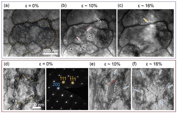 通过原位透射电子显微表征,研究发现位错胞结构中不同类型的位错墙因结构特性不同而对应不同的强化机制。其中,具有晶体取向差的位错墙本质上表现为低角度晶界,主要通过晶界强化作用阻碍位错运动;而无取向差位错墙则由统计存储位错的缠结构成,主要通过位错相互作用产生位错强化效应。两类位错墙在同一位错胞结构中的共存,使材料能够在同一微结构中同时实现晶界强化与位错强化的协同作用。