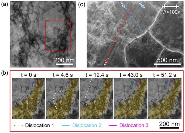 图4. 位错墙处的位错行为及位错滑移痕迹观测。