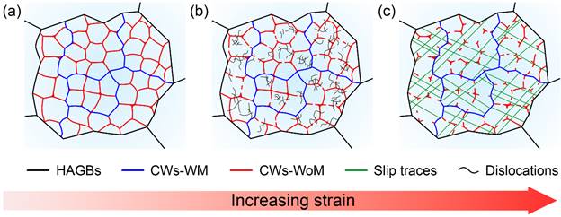 在完整的位错胞结构中,这两类位错墙的共存使材料同时具备晶界强化与位错强化两种机制,从而形成双重强化效应及其对应的强化过程。