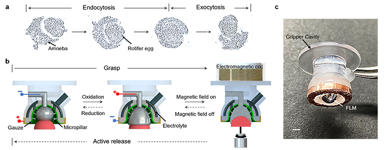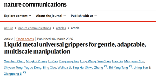 苏州大学李相鹏、孙立宁教授团队联合中国科学技术大学张世武教授、澳大利亚新南威尔士大学唐诗杨教授、伍伦岗大学李卫华教授、西北工业大学肖冰教授等国际联合团队,受变形虫捕食行为启发,成功研发出一种基于功能液态金属的通用抓手(LiMU)。该抓手通过电化学与磁场协同调控,实现了从皮克级到百克级物体的超柔顺抓取与主动释放,在微纳尺度物体操控中释放加速度高达42 G,刷新了机器人释放速度的世界纪录,操作接触压力低至10 Pa,为已有报道中的最低水平。这一突破性成果为机器人微操控提供了全新范式。LiMU抓手集超柔顺、多尺度、快速响应、环境自适应于一体,在活体生物样本、单细胞操作、微纳组装、深海探测等领域展现出广阔应用前景。相关研究成果《Liquid metal universal grippers for gentle, adaptable, multiscale manipulation》已于近日发表于国际权威学术期刊《Nature Communications》。
