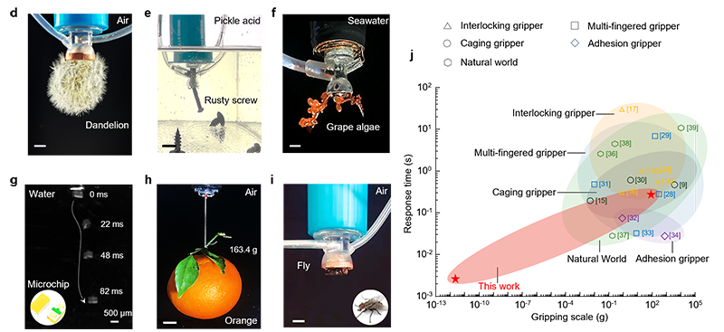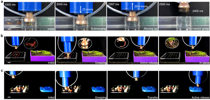 联合团队设计了一种“环境无关的表面活性调控机构”,通过多孔表面与微通道结构,使抓手在空气、海水、酸碱溶液等多种环境中均能稳定工作。同时,抓手可在200毫秒内捕获快速爬行的蟑螂,并能进行无视觉辅助的无序抓取任务,展现出极强的动态适应能力。