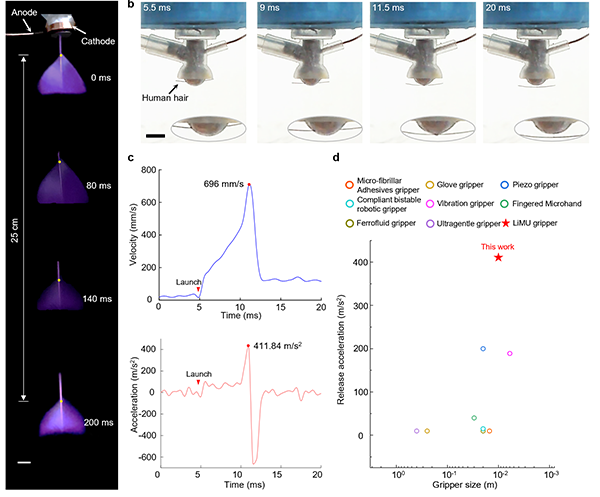 实验显示,对于直径70微米、重0.05毫克的人类发丝,LiMU抓手可在6毫秒内将其加速至696毫米/秒(约8700倍体长/秒),峰值加速度达42 G。这一指标不仅远超现有机器人抓手,也位列自然界生物与人工致动器中的最快释放速度之一。