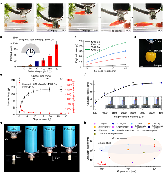 LiMU抓手执行操作时的接触压力最低可降至约10帕,为已有报道中的最低水平,远低于大多数脆弱生物组织(如软体动物、豆腐、葡萄藻)的屈服极限。实验中,抓手无损转运日本豆腐、金鱼幼苗,甚至蒲公英花,并对200枚斑马鱼胚胎实现了99%成功率的高效操控,后续发育与对照组无显著差异,充分证明了其优异的生物相容性。