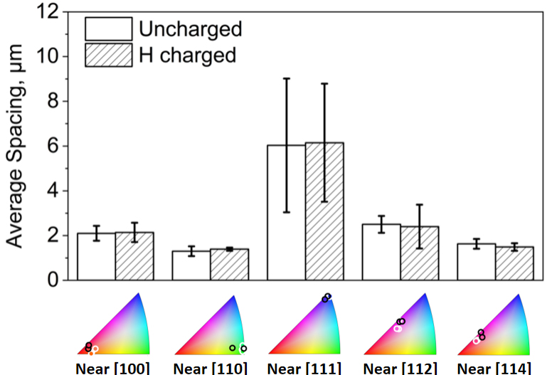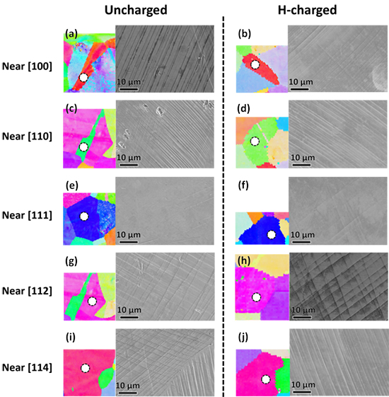 许多研究者将HE现象归因于氢抑制位错的交滑移,即“氢促滑移共面性”理论。该理论主要是以“氢增大滑移带宽度和高度”作为实验证据。然而,滑移带是位错演化在样品表面的凸起,而样品表面的位错演化与芯部是不同步的。此外,在比较氢对滑移带特征的影响时,未考虑晶体取向的影响,降低了“氢促滑移共面性”这一结论的科学严谨性。