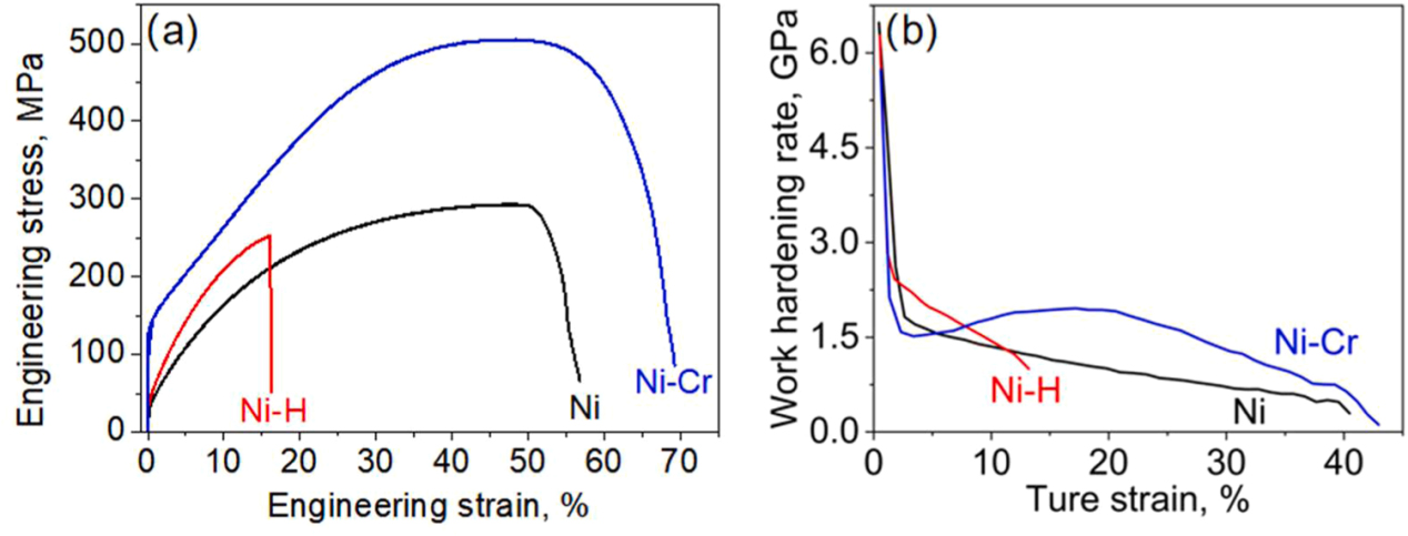 图4 Ni, Ni-H, Ni-Cr的拉伸曲线