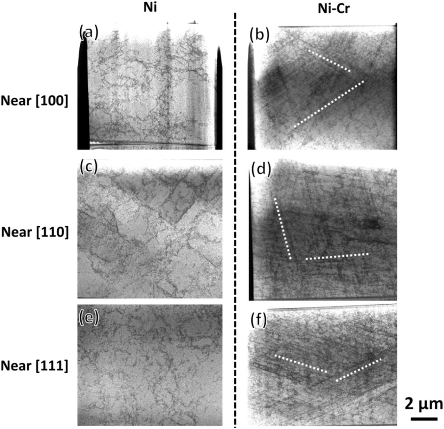 图5 Ni和Ni-Cr的位错组态(应变0.13):(a) (b) [100],(c) (d) [110],(e) (f) [111]