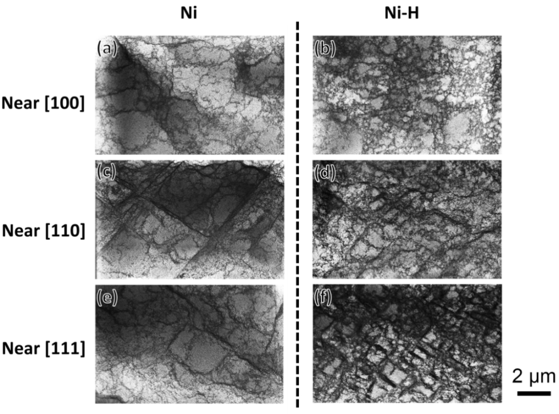 图3 充氢前后不同取向纯Ni晶粒的位错组态(应变0.16)[ref. 40]:(a) (b) [100],(c) (d) [110],(e) (f) [111]