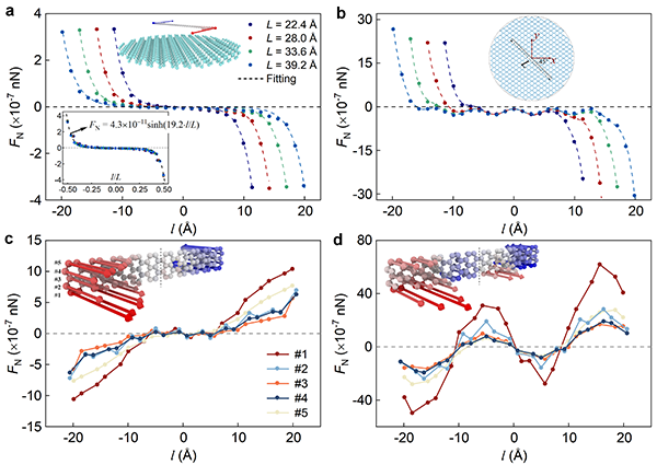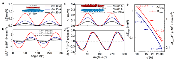 图2结果显示,力矩M与旋转角θ呈现出M ∝ −sin(2θ)的关系。根据不同尺寸的结果[图2(c), 图2 (d)],力矩-接触面积的线性关系在各向异性二维材料中再现。这是由于二维材料,除了边缘周围的原子外,每个原子之间的层间力贡献可以被视为相同,导致力-接触面积的线性关系。此外,由于单层黑磷的原子厚度,力矩衰减律在10 Å间距时为d−2.1;当间距增大到30Å时变为d−3.9。
