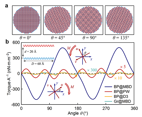 图1. 采用MBD方法、pairwise理论和D3方法计算得到的黑磷圆盘之间的范德华力矩