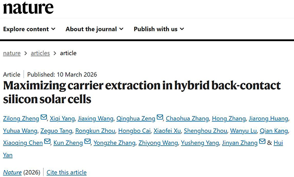 文献链接:“Maximizing carrier extraction in hybrid Back–contact silicon solar cells”(Nature,2024,10.1038/s41586-026-10351-8)