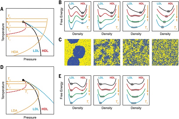 水在常压下展现出诸多反常特性,例如密度在277 K时达到最大值,而过冷状态下等温压缩率、热容等相关物理量在228 K附近出现发散现象。为解释这些异常行为,1992年科学家提出液-液临界点假说,认为过冷水中存在高密度液态水(HDL)与低密度液态水(LDL)之间的液-液转变(LLT),该转变终止于一个液-液临界点(LLCP)。然而,对LLCP的直接实验验证极具挑战性,因为过冷水在预测的临界点区域会在微秒时间尺度内迅速结晶,严重阻碍了对液态行为的探测。此前研究主要依赖间接证据,如物理性质外推、无定形冰的存在以及分子动力学模拟等,缺乏直接的实验依据。