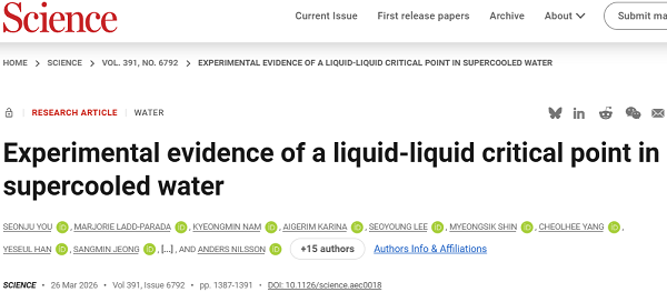 原文详情:Experimental evidence of a liquid-liquid critical point in supercooled water (Science 2026, 391, 1387-1391)