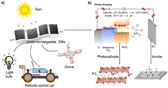 (a) 光充锌离子电池的应用示意图;
