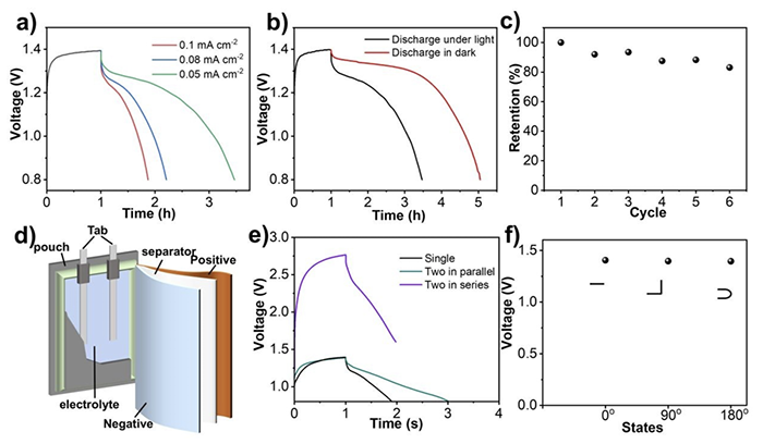 (f) 所制备光充电锌离子电池在不同弯折状态下的电压变化。