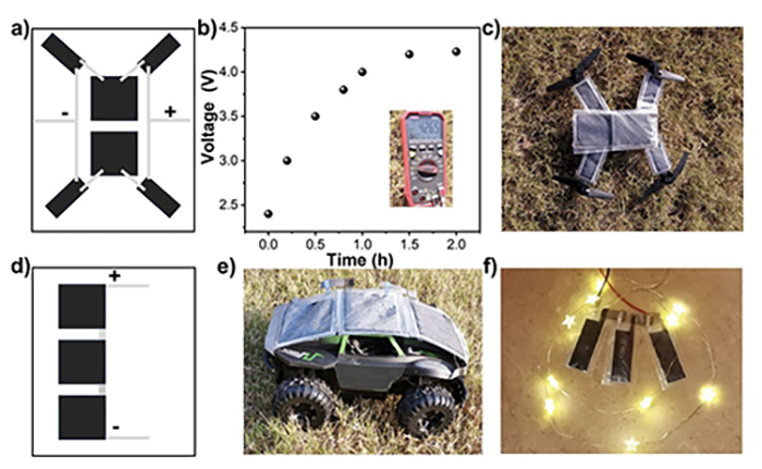 研究表明,该MnO2/TiO2光充锌离子电池在光照条件下可实现374 mAh g-1的高比容量,明显高于暗态下的230 mAh g-1;在纯光充电条件下,器件开路电压可达到1.39 V,最高光电转换效率达到1.5 %。进一步地,作者还构建了由多个器件串并联组成的集成模块,在自然光照条件下完成光充电后,可成功驱动无人机、模型小车和灯泡等电子设备,展示出该体系在柔性、自主供能器件中的应用潜力。该工作为MnO2基光充锌离子电池提供了一种简单而高效的界面设计策略,也为构筑绿色、低成本、可持续的光充储一体化能源系统提供了新思路。