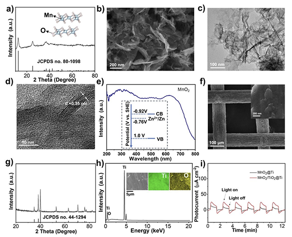 在众多储能体系中,锌离子电池由于具有资源丰富、安全性高、环境友好和成本低等优势,近年来受到广泛关注。若将其与光电转换过程耦合,有望构建兼具绿色性和实用性的光充储一体化器件。然而,目前光充锌离子电池仍面临一个关键瓶颈,即光正极材料的光电转换效率偏低,导致其整体性能受限。MnO2作为一种常见的锌离子存储材料,具有理论容量较高、原料廉价和低毒等优点,但其光生载流子分离能力有限,严重制约了器件的进一步发展。