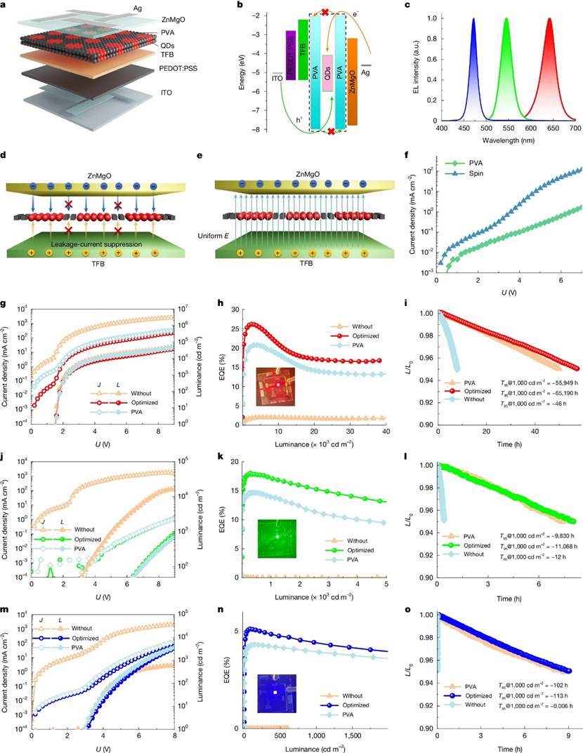 图3 无PVA势垒层、有PVA势垒层和介电常数优化的PVA势垒层的图图化RGB QLED器件的结构和光电性能© 2026 Springer Nature