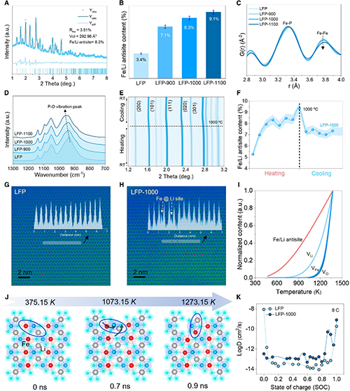 图3. 超快烧结对材料微微结构的调控。(A) LFP-1000的SXRD谱图和Rietveld精修结果。(B) SXRD图Rietveld精修后的LFP、LFP-900、LFP-1000和LFP-1100的Fe/Li反位含量。(C)同步辐射X射线全散射数据中LFP、LFP-900、LFP-1000和LFP-1100在2.8 ~ 4.0 A˚ r范围内的PDF图。(D) LFP、LFP-900、LFP-1000和LFP-1100的FTIR光谱。(E) LFP超快烧结过程中记录的原位SXRD等高线图。(F – h)从原位SXRD图的相应细化结果(F)看出超快烧结过程中Fe/Li对位物含量的演变。LFP (G)和LFP-1000 (H)的HAADF-STEM图像。 (I)通过DFT计算VLi、VFe、VO和Fe/Li对位4种不同缺陷的缺陷浓度随温度的变化。(J)用AIMD模拟了Fe/Li反位的形成过程。(K)根据图S33中相应的GITT图,推导出LFP和LFP-1000在8℃充电时的Li+扩散系数D。