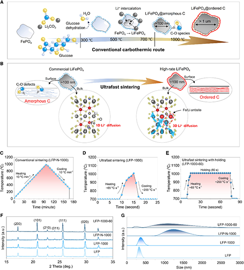 当前,大量商用电池级橄榄石类正极材料在满足下一代快速充电技术的需求方面面临着重大挑战。将这些大量现有材料的丢弃或不加选择地回收将造成严重的资源浪费和环境负担。如何进一步提高商用橄榄石类正极材料的快充能力是当前研究者所深思熟虑的问题。以橄榄石型磷酸铁锂(LiFePO₄,LFP)为例,其电子导电性的核心调控手段之一是优化表面碳层的结晶度。传统碳热合成工艺的烧结温度通常为 600℃–800℃,在此温度下生成的碳层结晶度偏低,多为近无定形结构,电子导电率难以满足快充需求。理论上,提高烧结温度可显著提升碳层结晶度与材料电导率,然而,这引发了另一个问题:从热激活晶体生长的 Arrhenius 动力学方程的角度来理解,在常规烧结模式下,提高烧结温度可能会显著增加晶粒径尺寸,从而对 LFP 的倍率性能产生不利影响。行业痛点由此凸显:若能在提升 LFP 表面碳层结晶度的同时,完全保留其原生纳米颗粒尺寸,商用橄榄石类材料快充性能的 “天花板” 便有望被彻底打破。