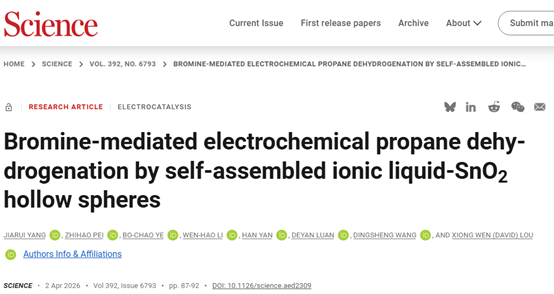 原文链接:Jiarui Yang et al. , Bromine-mediated electrochemical propane dehydrogenation by self-assembled ionic liquid-SnO2 hollow spheres. Science 392,87-92 (2026).