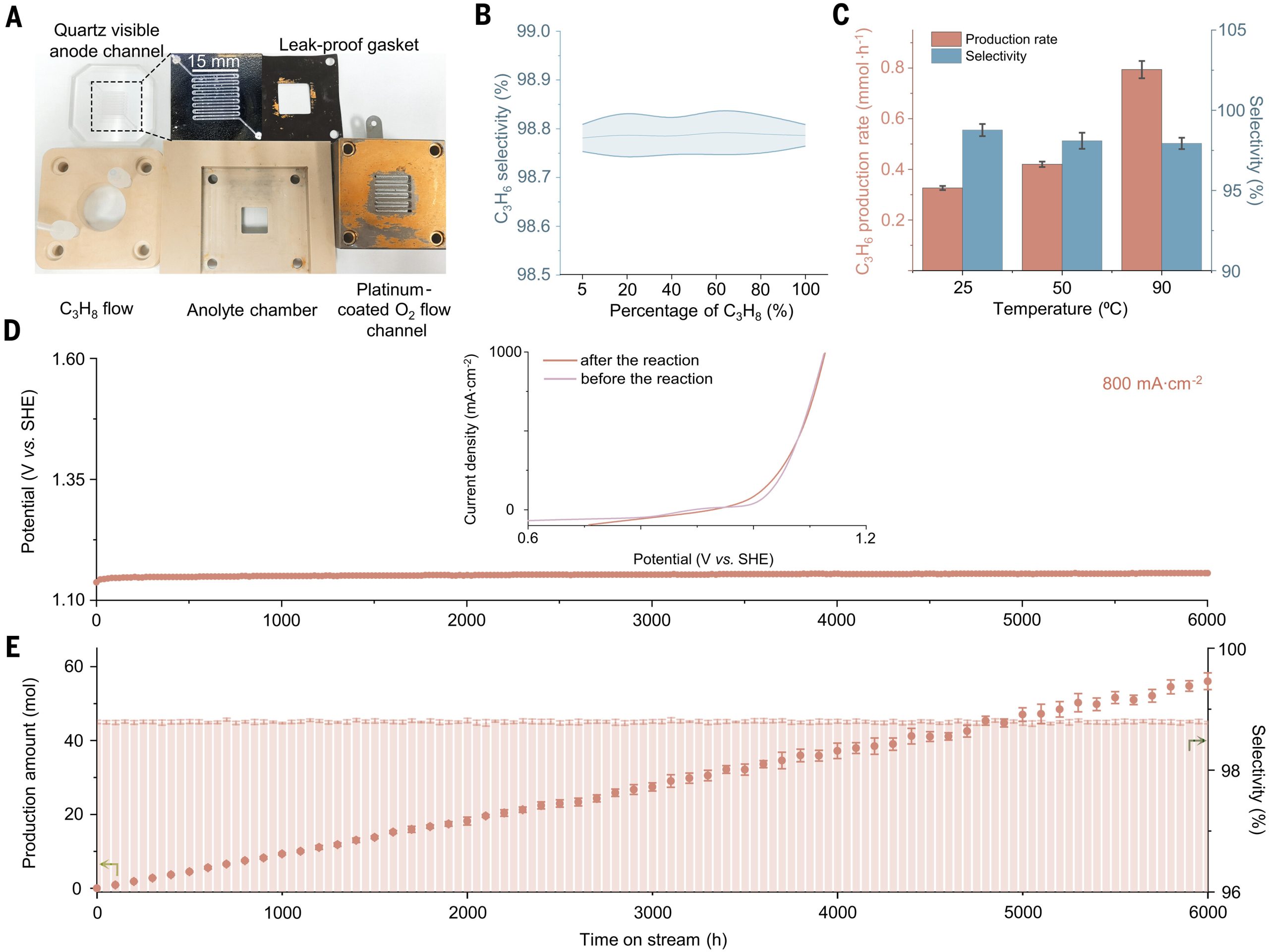 为解决上述问题,香港城市大学楼雄文教授,杨嘉睿研究助理教授和清华大学王定胜教授等人开发出溴介导、基于自组装 IL-SnO2空心球电催化剂的电化学丙烷脱氢技术,实现了常温下高效、高选择性、长稳定性制丙烯的突破。其摒弃了传统热催化高温高能耗的模式,能在常温下完成丙烷脱氢,从根源上解决了热催化易结焦、产物分离难的痛点,也攻克了传统电催化丙烷脱氢选择性低、催化活性差的核心难题,实现了> 98%的丙烯选择性、>99%的产物纯度,且能在 800 mA/cm2 工业级电流密度下稳定运行6000 h。同时该催化剂实现了电子结构与界面性质的精准调控,让丙烯选择性和产物纯度大幅提升,且具备优异的长期稳定性,验证了电化学丙烷脱氢的工业化可行性,为低碳烷烃定向转化提供了全新工业化思路。该成果以“Bromine-mediated electrochemical propane dehydrogenation by self-assembled ionic liquid-SnO2 hollow spheres ”为题发表在国际学术期刊《Science》。