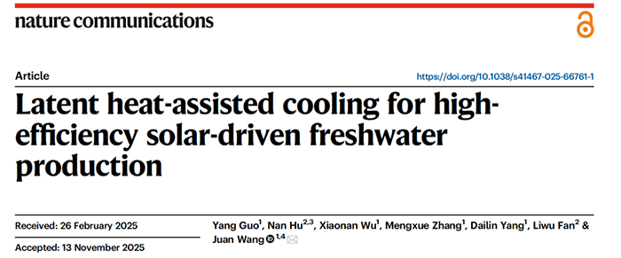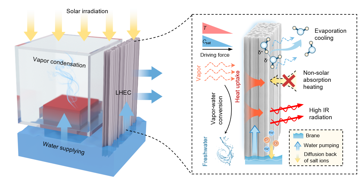 随着全球人口增长和气候变化加剧,清洁淡水资源短缺问题日益凸显,发展高效、低成本、可持续的淡水获取技术已成为环境与能源领域的重要研究方向。太阳能驱动界面蒸发技术因其能量来源清洁、系统结构简单且适应性强,在海水淡化与污水净化等方面展现出广阔应用前景。该技术通过将太阳能局域化转化为蒸发潜热,实现高效水蒸气生成,并有效阻隔盐分等非挥发性杂质。然而,尽管界面蒸发速率已得到显著提升,实际淡水产率仍普遍低于理论蒸发能力,其核心限制来自蒸汽冷凝过程中的散热不足。现有的环境对流冷却或被动辐射冷却策略在高温或复杂气候条件下易受环境因素制约,难以满足高效稳定运行需求。因此,发展一种可在不同环境条件下持续、高效释放冷凝热的被动调控策略,对于突破太阳能界面蒸发系统的产水瓶颈具有重要意义。基于此,充分挖掘水相变潜热在系统热管理中的作用,为太阳能淡水生产提供了一种新的研究思路。