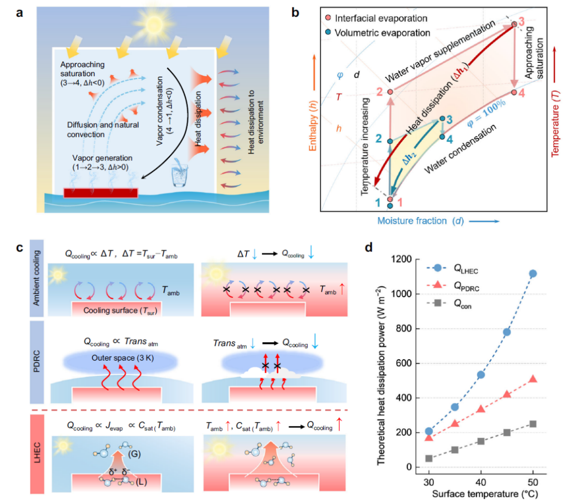 图1封闭环境下太阳能驱动淡水生产所涉及的热耗散过程:(a) 封闭环境中太阳能驱动淡水生产过程示意图;(b) 闭环循环中太阳能界面蒸发及水冷凝收集焓湿图;(c) 环境冷却、被动日间辐射冷却与潜热蒸发冷却策略的对比示意图;(d) 不同冷却策略随冷却表面温度变化的冷却功率对比。