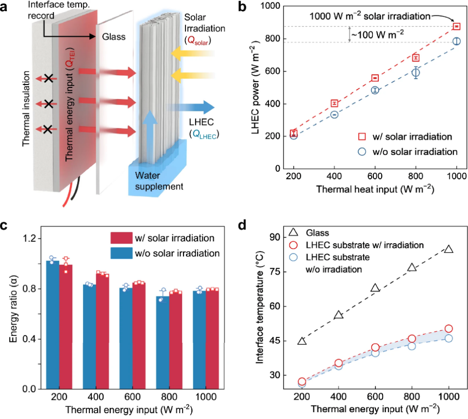 图3:(a)用于测量脱木素木材LHEC性能的自组装实验装置示意图;(b)脱木素木材在逐渐增加的热输入过程中有无太阳辐照时的LHEC功率曲线;(c)LHEC功率与总热输入的能量比随热输入变化的曲线;(d)脱木素木材与对照样品玻璃基底在不同热输入下的界面温度变化。