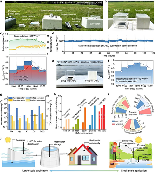 图5:(a, b)户外太阳能淡水生产实验现场照片;(c)晴天条件下LHEC辅助系统与裸玻璃系统的产水率对比;(d)在模拟海水环境中LHEC基底在持续热负荷下的散热稳定性测试;(e, f)海上漂浮式LHEC辅助系统实物图及其在海水条件下的户外产水性能;(g)原水与经LHEC系统净化后水样的离子浓度与总有机碳对比;(h)LHEC辅助系统与其他代表性冷却策略在太阳能产水效率方面的比较;(i)LHEC协助装置在一年运行周期内的经济性分析;(j)LHEC辅助太阳能蒸发策略在海上浮式淡化与野外应急取水等场景示意图。