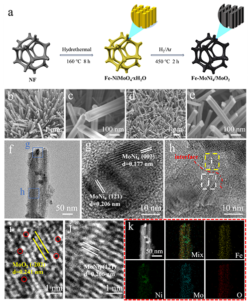 图1. (a) Fe-MoNi4/MoO2催化剂的合成示意图. (b-c) Fe-NiMoO4 ∙xH2O和(d-e) Fe-MoNi4/MoO2的SEM图. (f) Fe-MoNi4/MoO2的TEM图像. (g-j) Fe-MoNi4/MoO2的HRTEM图像;(k) Fe-MoNi4/MoO2的元素mapping图像.
