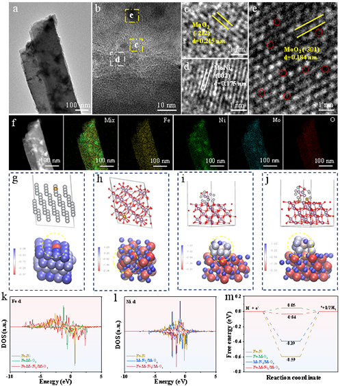 图4. HER反应后Fe-MoNi4/MoO2的 (a) TEM图, (b-e) HRTEM图, (f) EDS元素分布图. (g) Fe‑Ni, (h) Fe‑MoO2, (i) MoNi4/MoO2和 (j) Fe‑MoNi4/MoO2的结构模型与Bader电荷分析(蓝色代表电子聚集,红色代表电子耗散). (k) Fe和 (l) Ni的d轨道分态密度计算图. (m)各催化剂表面的氢吸附自由能图.